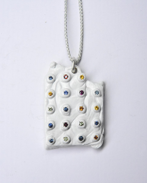 Right: UNTITLED PENDANT © Welfe Bowyer 2021 - Sterling Silver, Enamel, Nylon, Gemstones